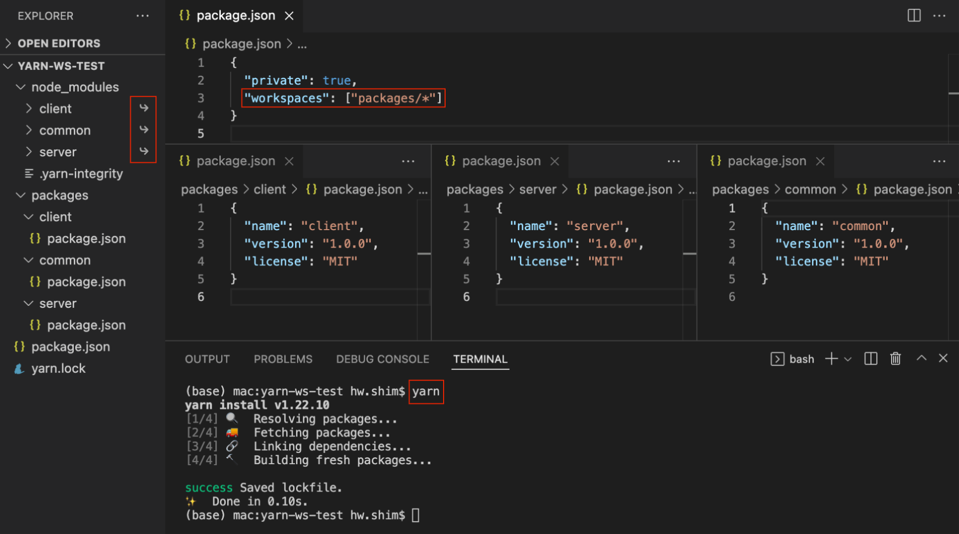 예를 들어 packages 디렉토리 안에 client, server, common 3개의 워크스페이스를 추가하고 루트에서 yarn 명령어를 실행했다고 하자. 그럼 루트 경로 node_modules 디렉토리 내부에 workspace들에 대한 심볼릭 링크가 생성된다.